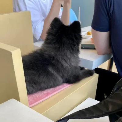I finally succeeded in grabbing a cup of coffee at one of those dog-friendly places that offer a menu and provide a seat at every table to our beloved pets.
